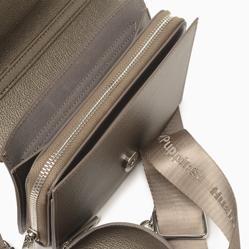 La bandolera Hush Puppies Bada  presenta un diseño estructurado y refinado. Está confeccionada en material sintético con acabado graneado. Dispone de tapa como cierre principal con botón imán, bolsillos internos con dos tipo plaque y otro central con cierre que incluye compartimiento para tarjetas. La correa es desmontable y regulable, personalizada con la identifiacion de la marca. Además, incluye un monedero desmontable con cierre. Medidas: alto 14 cm, ancho 19,5 cm y profundidad 6 cm.