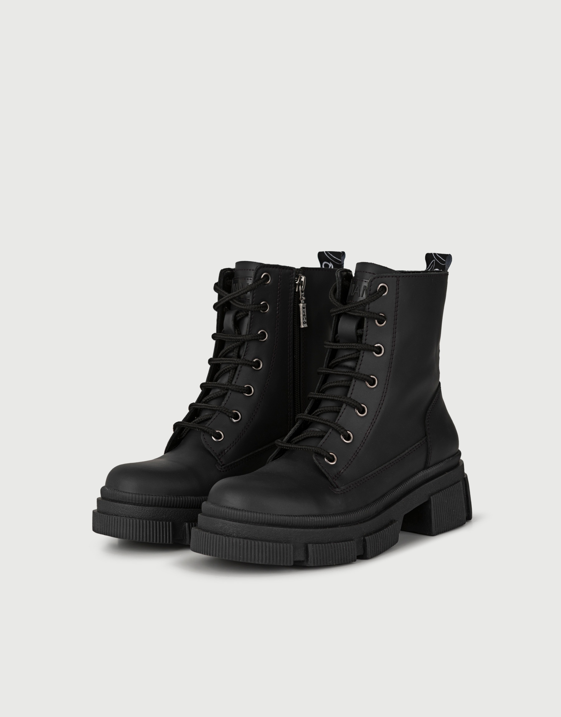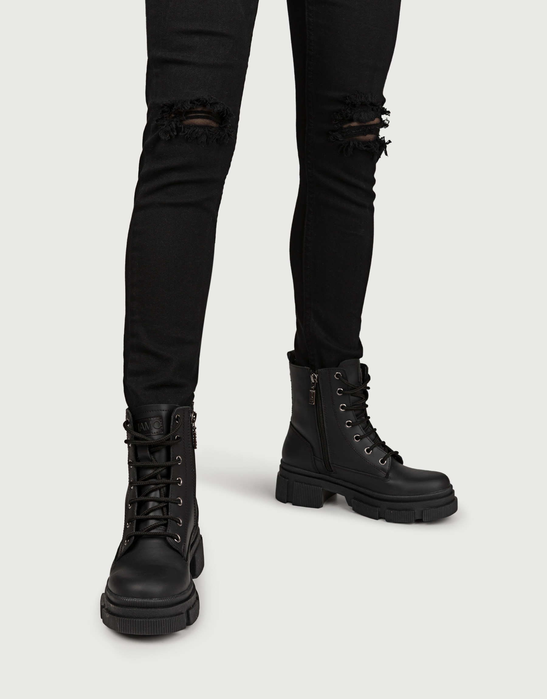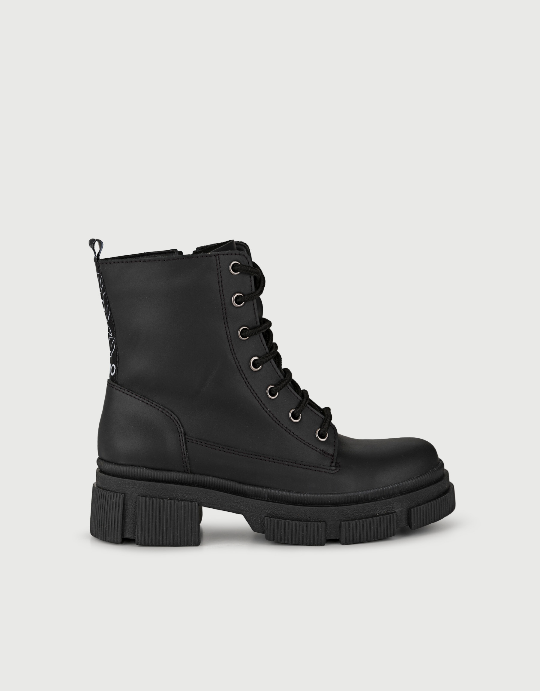 Borcego marca Viamo, de cuero liso con detalle de cinta estampada en el talón y base a tono. Altura: 5 cm – Sumále estilo a tus looks de invierno.