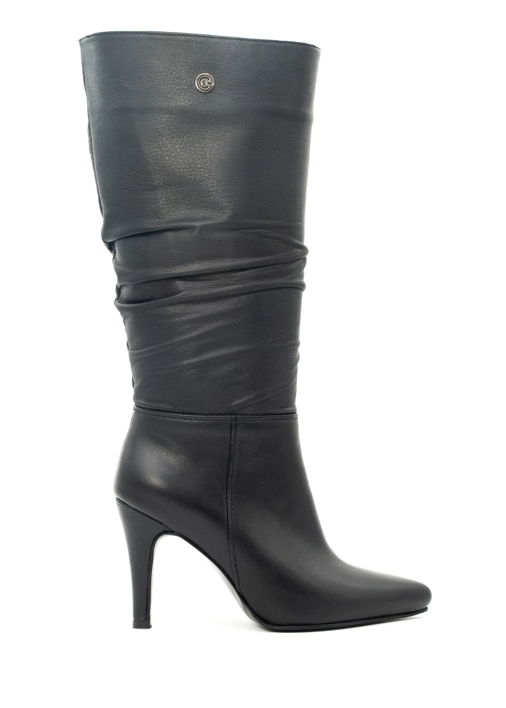 Es una bota en cuero vacuno flor, forrada en badana, taco de 8 cm, la caña es de 36 cm y el fondo es artesanal de suela.-