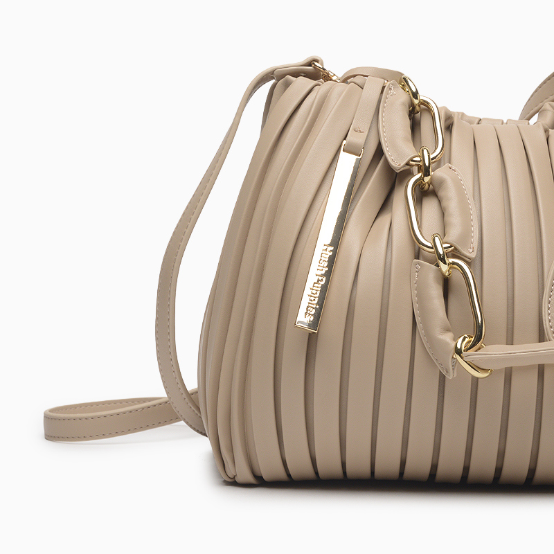 La Cartera Hush Puppies Derval color rosa está confeccionada en cuero sintético con efecto plisado vertical que aporta textura y estilo. Presenta botón imantado metálico y un doble sistema de asas: una correa larga regulable y desmontable para usar al hombro o cruzada, y una cadena decorativa con eslabones metálicos dorados combinados con tramos en cuero ecológico. Sus avíos metálicos dorados personalizados y el charm metálico añaden un detalle distintivo. De estructura flexible con base reforzada, ofrece un interior amplio pensado para el uso diario. Sus dimensiones son 26,5 cm de ancho, 22 cm de alto y 10 cm de profundidad.