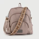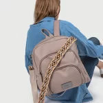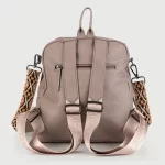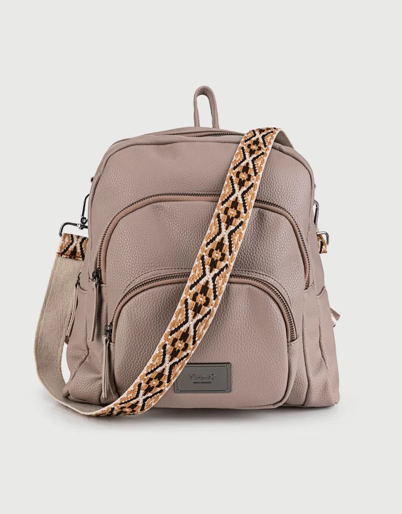 Mochila de cuero sintético graneado con detalle de correa de hombro regulable estampada, bolsillos frontales y cierres metálicos. Altura: 32cm – Largo: 27cm – Ancho: 9cm