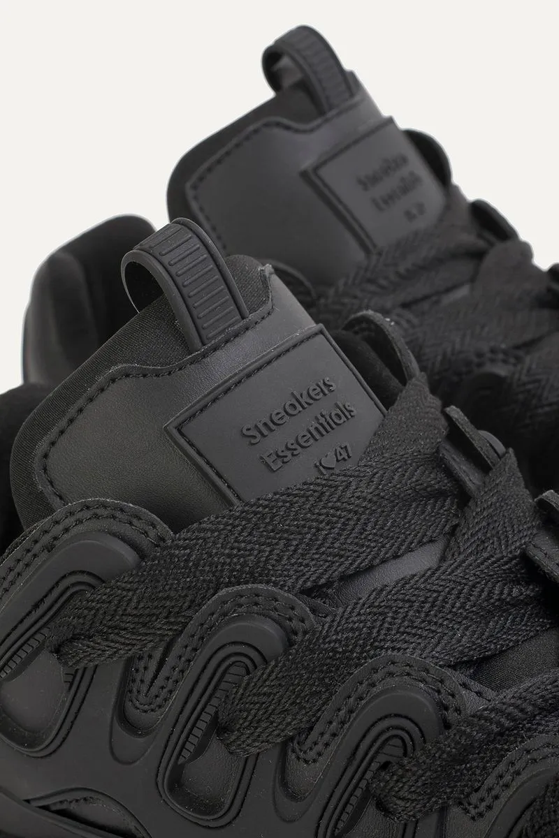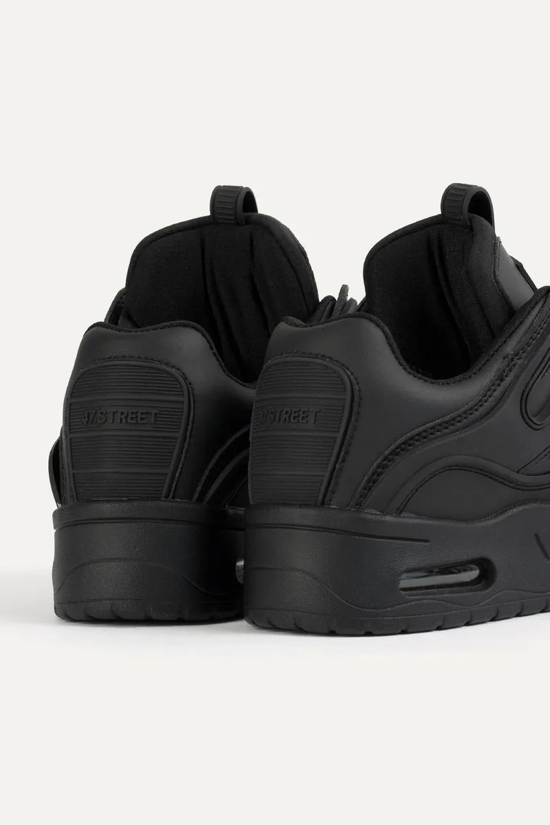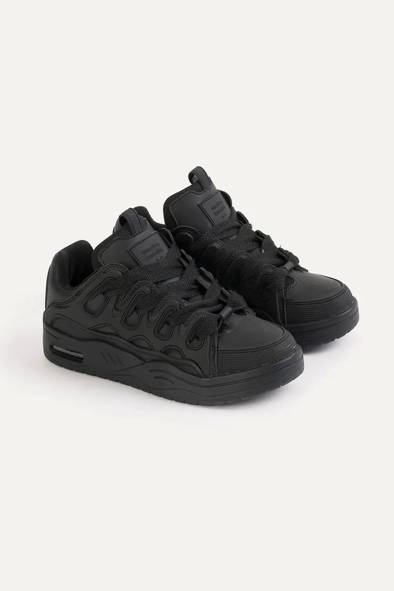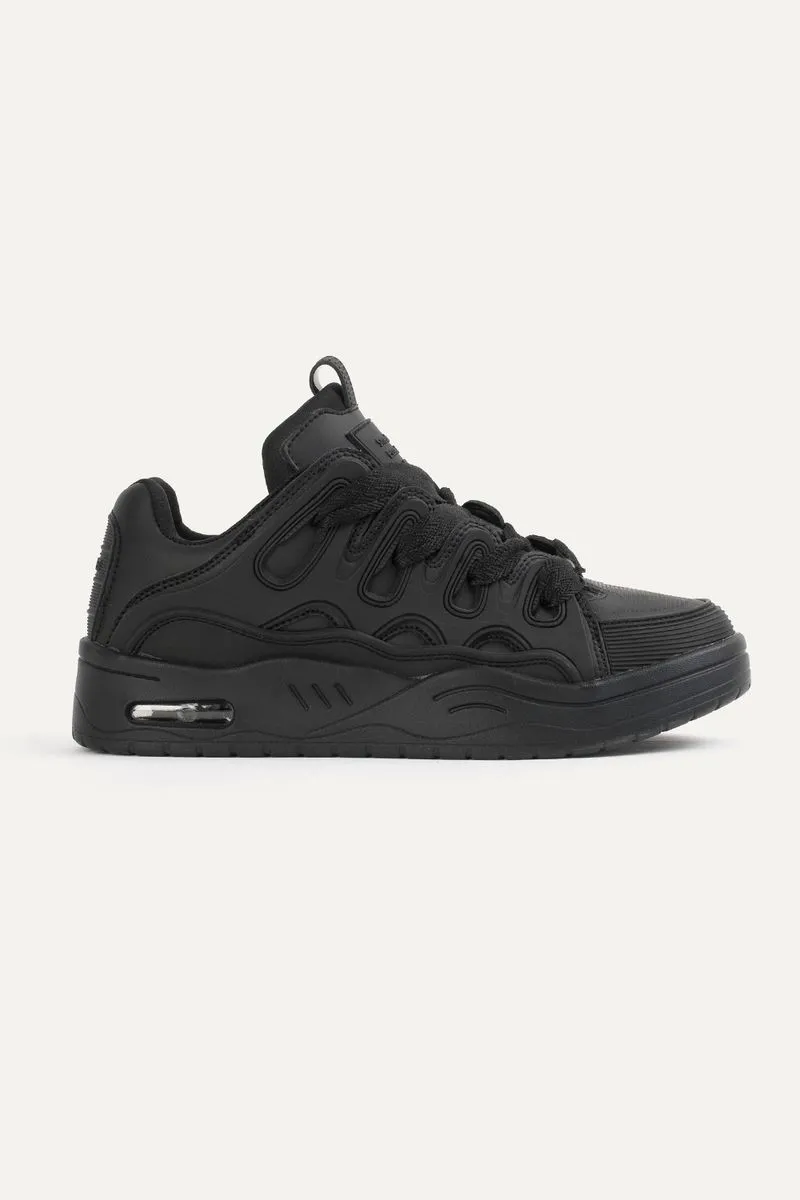 Zapatilla de PU con recortes en goma a tono, con interior de un tejido respirable y lengueta rellena. Acceso mediante cordonera, con cordones anchos de algodón y poliester. Base a tono con camara de aire en el talón. Producto genderless.-