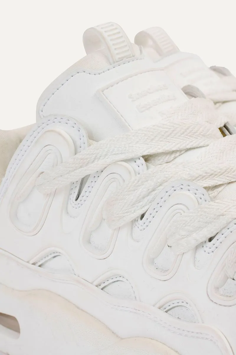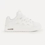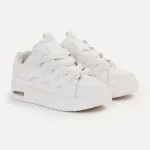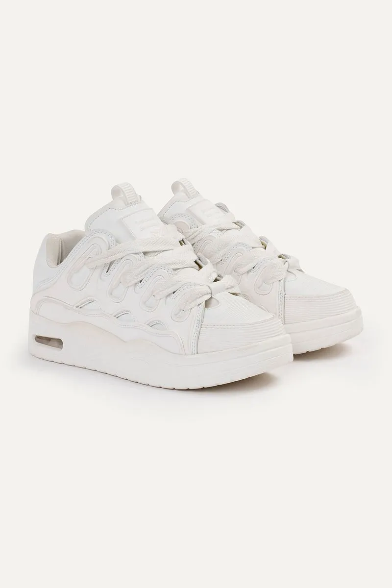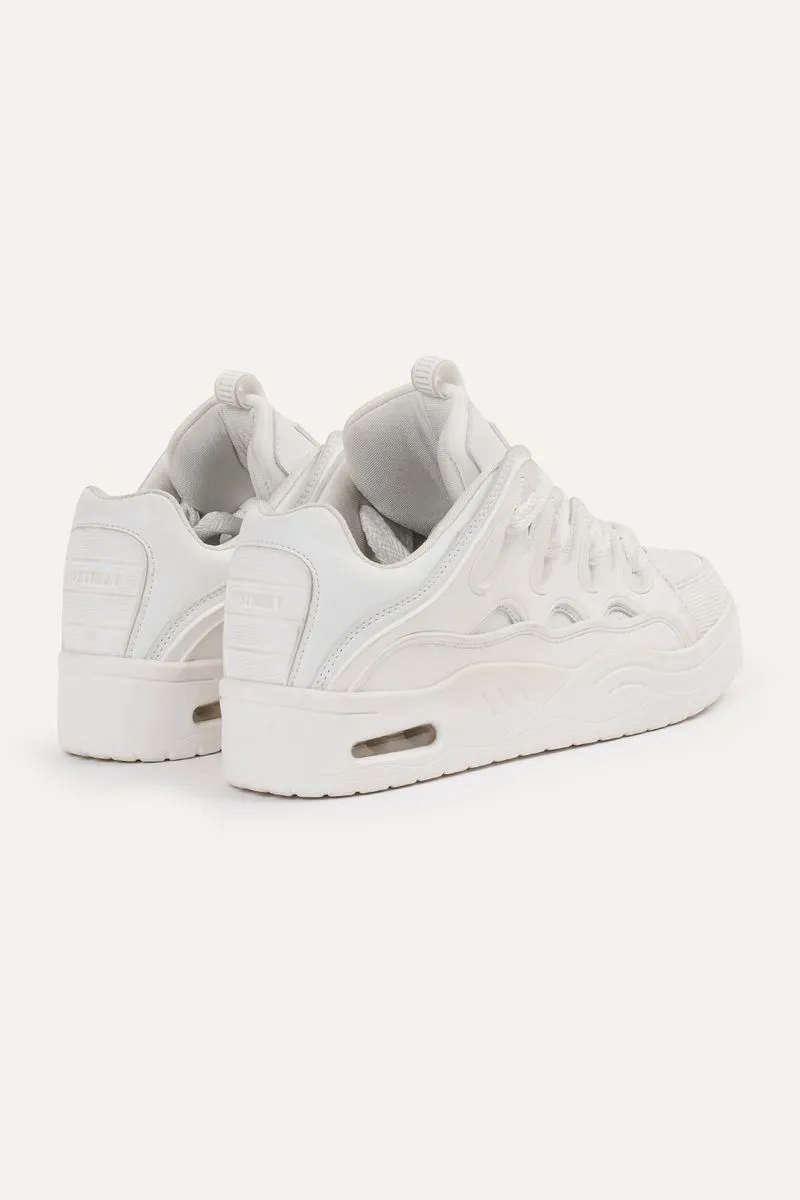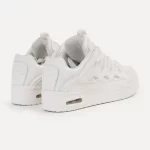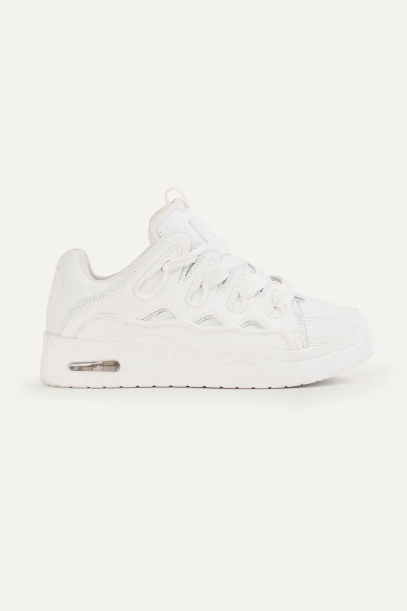 Zapatilla de PU con recortes en goma a tono, con interior de un tejido respirable y lengueta rellena. Acceso mediante cordonera, con cordones anchos de algodón y poliester. Base a tono con camara de aire en el talón.