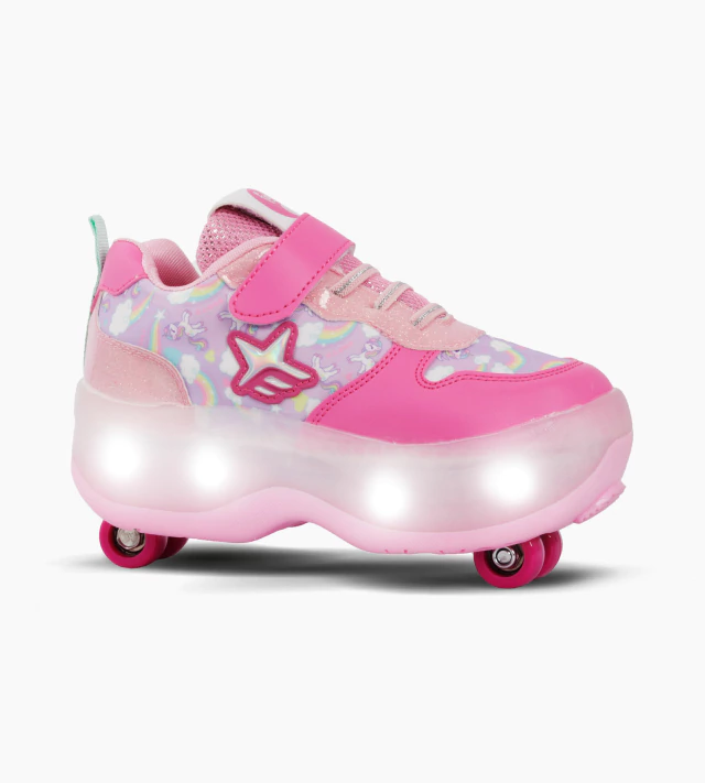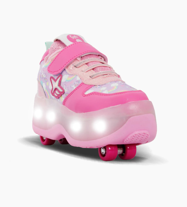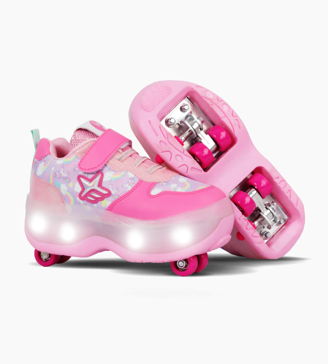Modelo de doble rueda rueda tipo patín ( con posibilidad de guardado con luces led recargables, capellada confeccionadas con materiales textiles y sintéticos. Botón on/off en la lengueta. Sistema de ajuste con abrojo y elástico Puntera y talón reforzados.