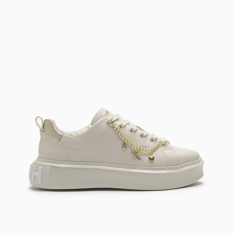 La Zapatilla Hush Puppies Badajoz Chain color beige cuenta con suela y capellada construidas con materiales súper livianos que casi no pesan, permitiéndote moverte con facilidad durante todo el día y absorbiendo el impacto de cada paso para un confort excepcional, esta es la tecnología Zero G. Está confeccionada en material sintético con pieza de talón a contra tono y un aplique de cadena con dijes en el lateral que realza su diseño. Incorpora plantilla de material sintético y EVA súper acolchada y confortable con identificación de la marca, mientras que el inserto de pieza rubber con identificación HUSH en relieve aporta estilo y durabilidad. La altura total de la suela es de 3,6 cm.