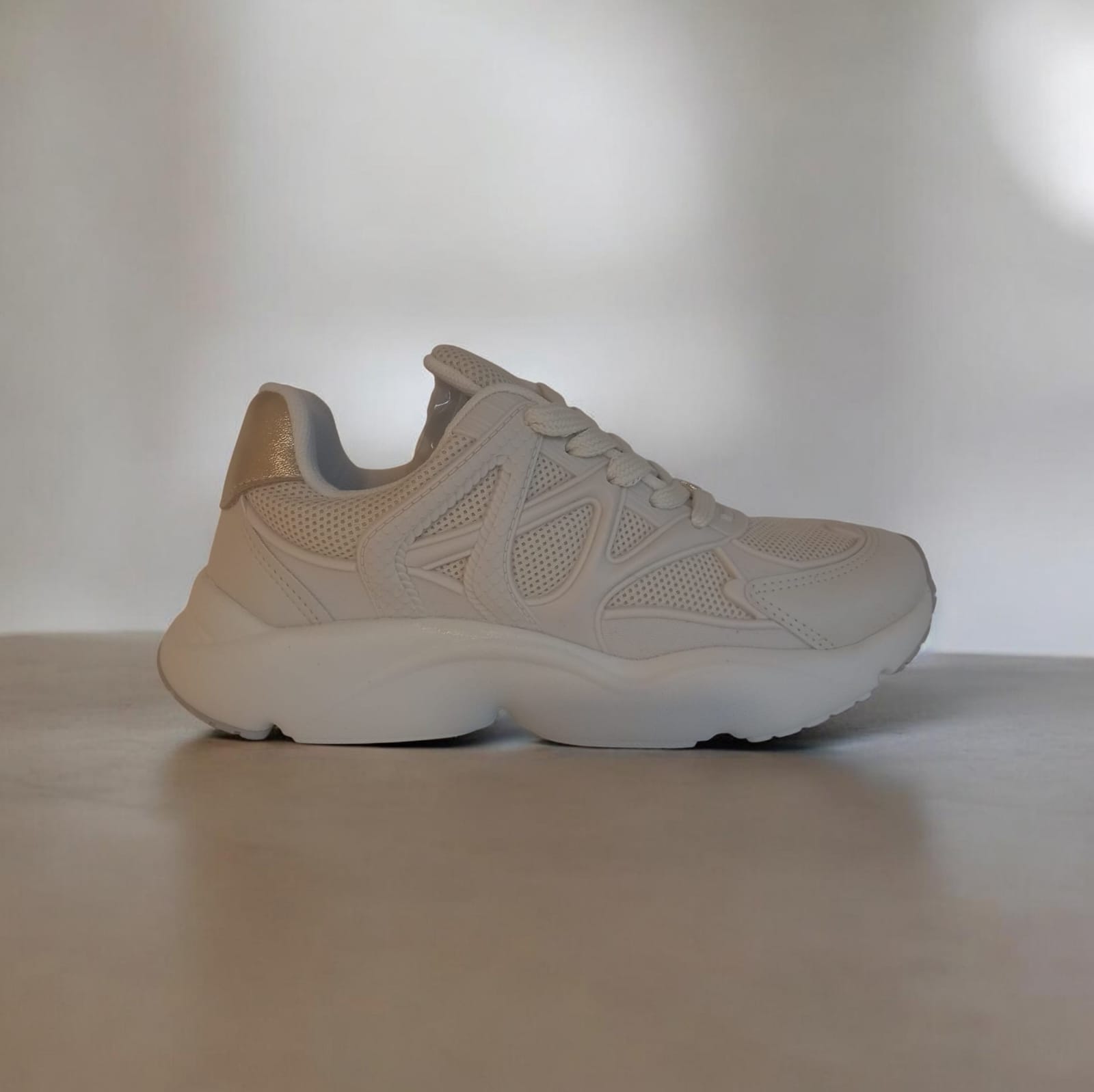 Moderna y súper cómoda, esta zapatilla de estilo chunky es perfecta para quienes buscan un look urbano con personalidad. Su diseño combina distintos materiales y texturas en tonos neutros, logrando un estilo versátil y fácil de adaptar a cualquier outfit.