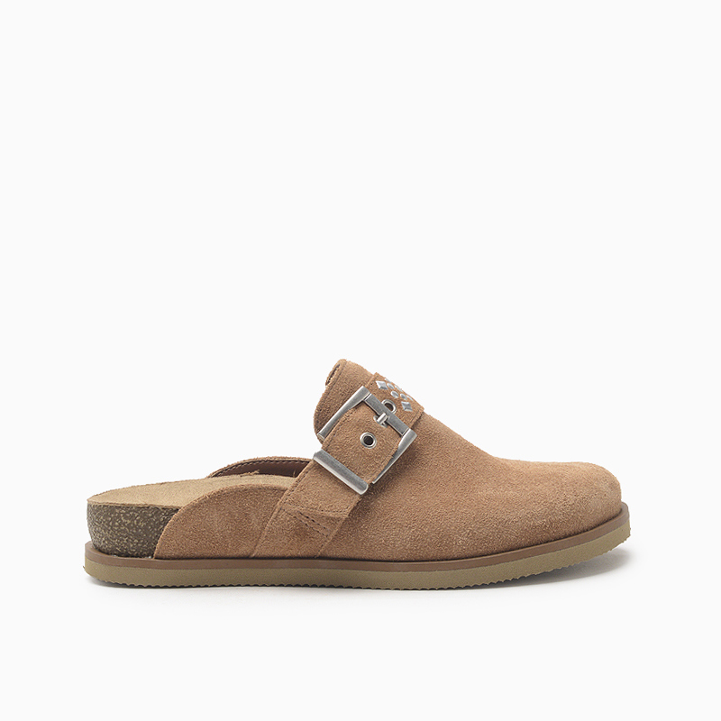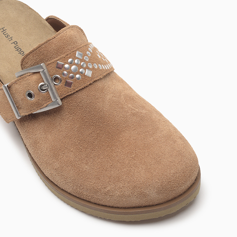 El Zueco Hush Puppies Ada color suela confeccionado en cuero descarne, con tira de capellada que incorpora una hebilla de metal y un aplique de arte transfers que aporta un detalle distintivo. La plantilla forrada en microfibra con identificación de la marca ofrece suavidad y confort, mientras que el suelín de EVA con una altura total de 1,2 cm garantiza una pisada liviana y cómoda.