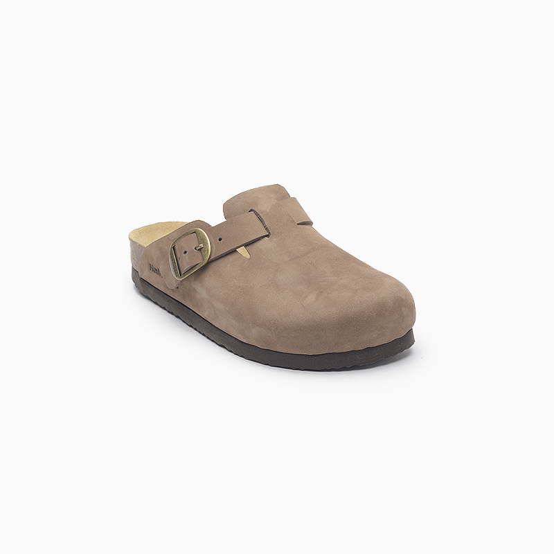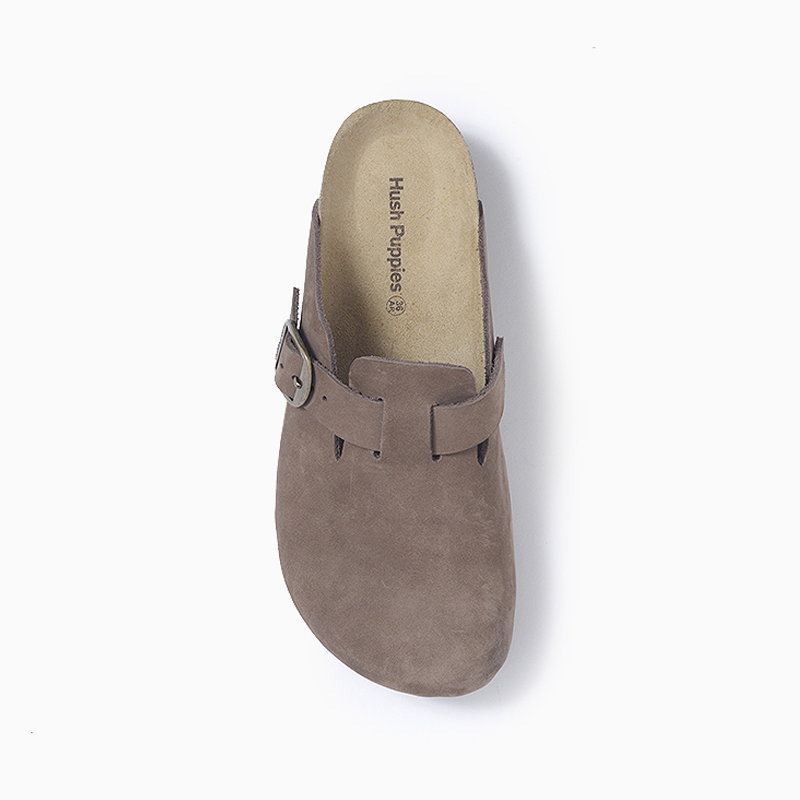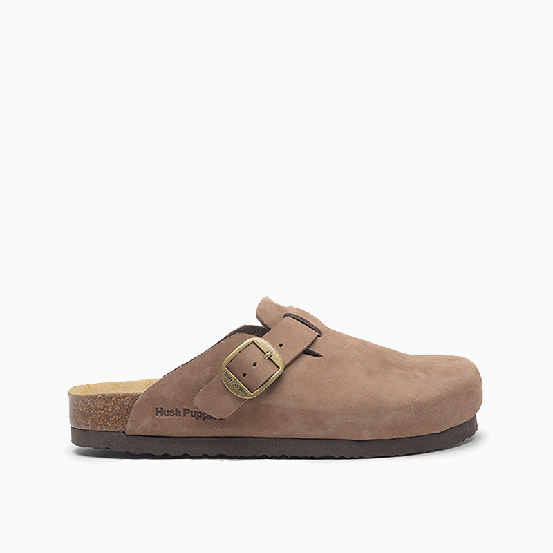 Zueco en cuero nobuck con hebilla con identificación Hush Puppies al tono de la capellada. Plantilla en corcho con identificación. Suelín de eva con una altura de 3 cm.